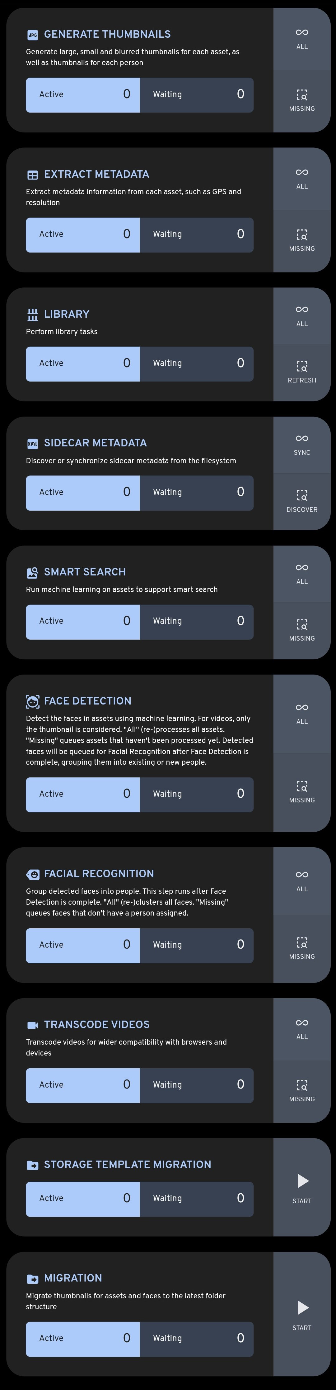 When a new asset is uploaded it kicks off a series of jobs, which include metadata extraction, thumbnail generation, machine learning tasks, and storage template migration, if enabled. To view the status of a job navigate to the Administration -> Jobs page.